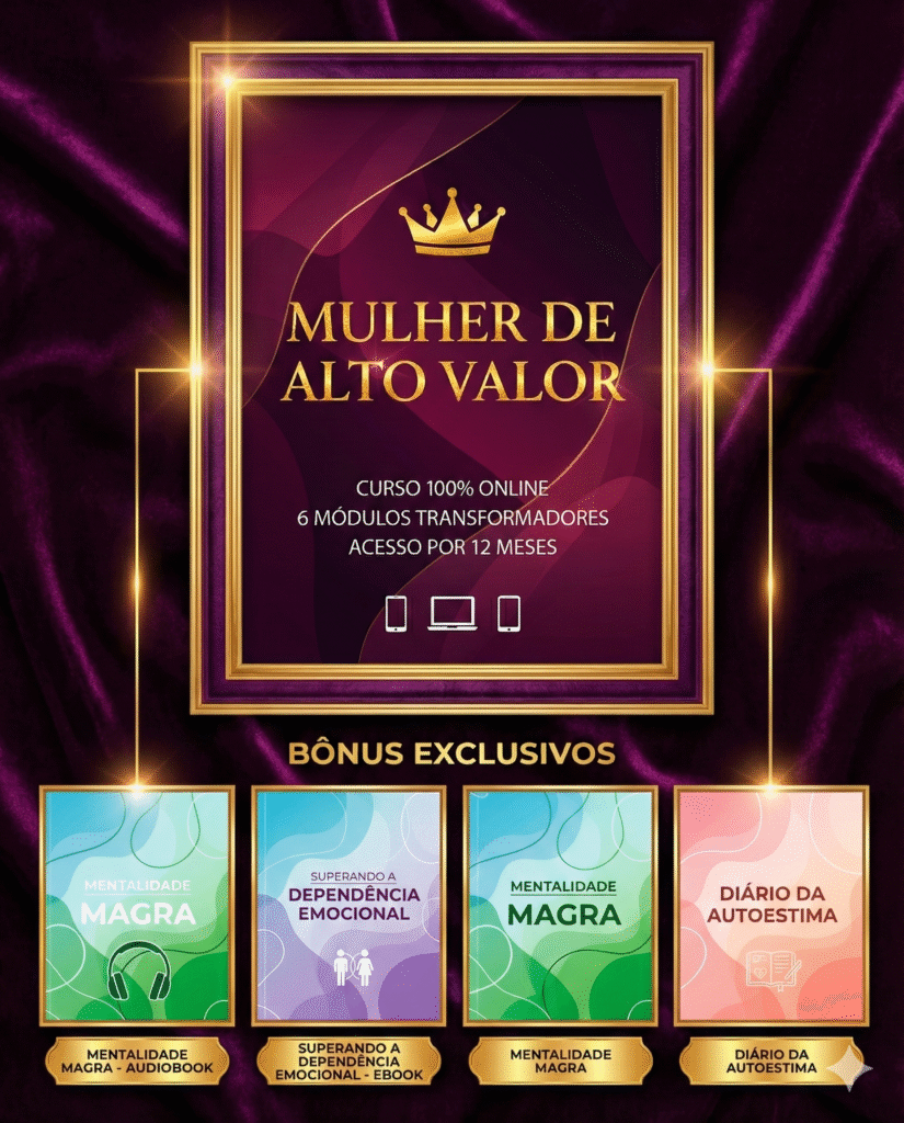 Foi assim que nasceu o método que hoje compõe o curso Mulher de Alto Valor — uma jornada de transformação, baseada em ciência, coaching, PNL e reprogramação emocional, criada para mulheres que estão prontas para romper com o que as trava e viver sua melhor versão.